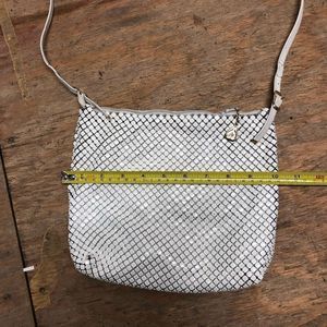 This timeless cross body shoulder bag by Whiting and Davis is made of their classic harlequin mesh in a creamy shade of white, with their signature lining, and W & D zipper pull, both popular in the 80s.