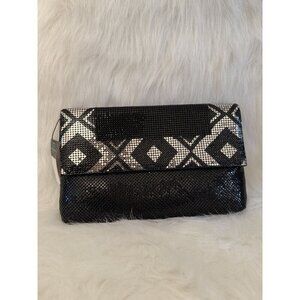 The Whiting & Davis Aztec Clutch in black and silver showcases a bold Aztec pattern adorned with shimmer. Its sleek design offers elegance and versatility, making it perfect for both formal events and nights out. With a spacious interior for essentials, this clutch elevates any outfit with its glamorous flair.