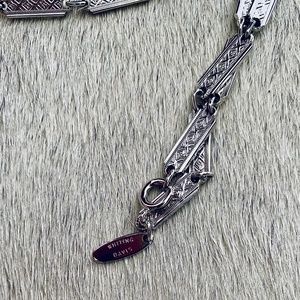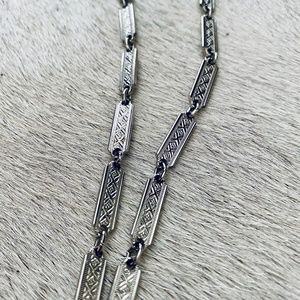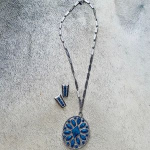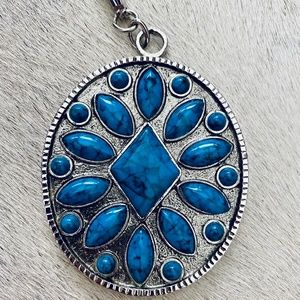 New! Never wore. Vintage silver tone and faux turquoise necklace and clip-on earrings set in pristine condition. I believe they made in 1970s. The pendent is approximately 2-1/2” long and 2-1/8” wide with a silver tone patterned chain which is approximately 24” long. The earrings are approximately 1” long and 1/2” wide.