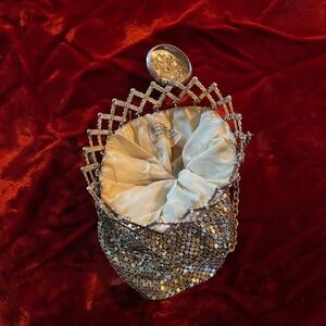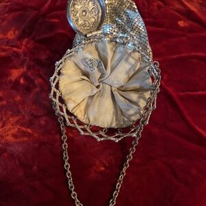 The Whiting & Davis Silver Mesh Purse Beggars Purse is a vintage accessory from the 1920s in the United States. Designed specifically for the Little Black Dress occasion, this original purse features an expandable gate neck with a chain for added convenience. Crafted from mesh material, this silver purse exudes an elegant eveningwear look, making it a sophisticated addition to any woman's wardrobe.