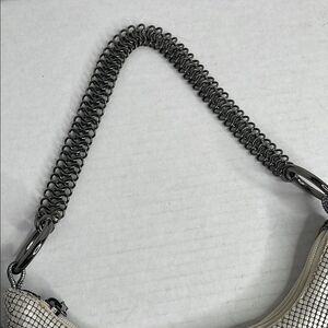 Elegant Whiting & Davis shimmering silver mesh chainmail with metallic silver snakeskin leather panel in front and back. Gunmetal chain strap with top zip closure. Signature black interior lining with a zipper and 2 slip pockets. New condition.