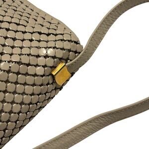 Metal Mesh Crossbody Bag by Whiting & Davis. EUC. No flaws or stains. A true vintage gem from the 1960s, this Whiting & Davis cream metal mesh bag features a sleek silhouette with a zip top closure and a charming heart-shaped zipper pull. Designed with a matching leather strap that is fully removable, allowing the bag to transition seamlessly from a crossbody to a chic clutch. A timeless piece that captures classic glam with functional versatility.