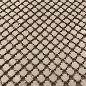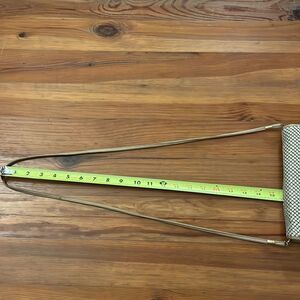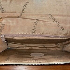 Vintage, cream, beige, metal, chainmail, mesh, crossbody purse, bag by Whiting & Davis. The tan, beige, thin strap has about a 21.5 inch drop. Fabric lined interior with signature logo print. Zippered interior pocket. There is a pen stain on the bottom interior corner that has bled to the outside. Not noticeable when used. See photos. I have not attempted to clean so you might be able to get it out. The strap and trim feel more like faux leather to me. I'm not sure of the age of the bag but it looks like the 1980s to me. In very good pre-owned condition with some signs of wear from normal use.