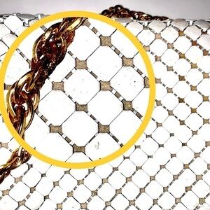 Whiting and Davis Co. mesh bag purse with a chain mail design. This medium-sized bag in white and gold can be worn as a shoulder bag or crossbody. Made of mesh metal in the USA.