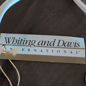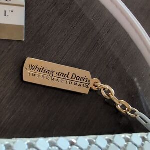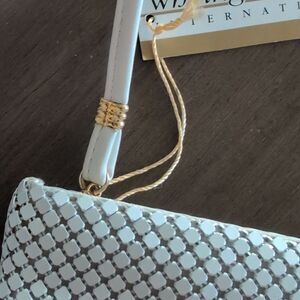 NWT Whiting and Davis International White Metallic Mesh Shoulder Evening Bag Clutch. This elegant bag features a top zipper, branded zipper pull, gray interior branded lining, 1 interior slip pocket, gold hardware, and detachable straps.