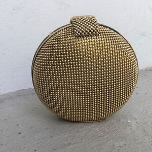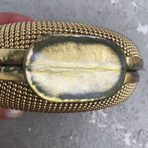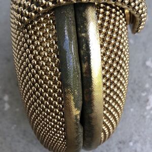 Vintage canteen bag, the bag itself is in good condition but if you see the edges which I show in pictures, they need to be retouched with GOLD as the bottom needs it also. Chain has a kink but is in perfect condition. Inside is clean. Measuring through the center across it’s almost 6 inches width 2” Chain drop is 20.