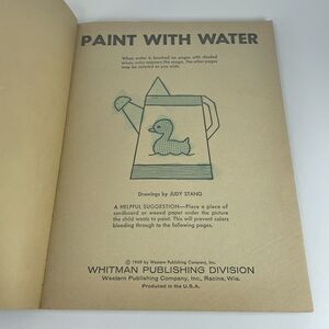Whitman Paint with Water Book dated 1969. Coloring Activity Book for Kids. I am unsure if this is used or if some kind of reaction has happened through the years. Only the blue areas of the book appear to be lightly "painted". Please look at the pictures so you know what you are buying.
