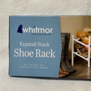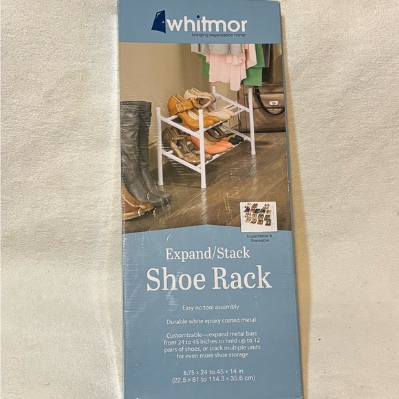 Whitmor Expand/Stack Shoe Rack in white. Durable white epoxy-coated metal construction. Expandable and stackable design for customizable shoe storage. Easy, tool-free assembly for fast setup.
