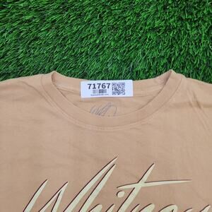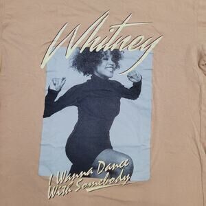 Iconic Whitney Houston tee with bold dance-era photo and vintage-style font fits womens medium to large soft peach tone
