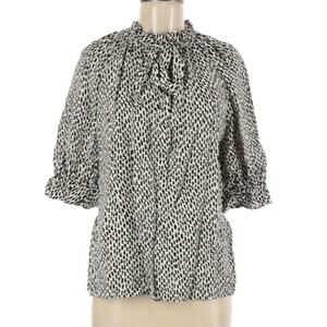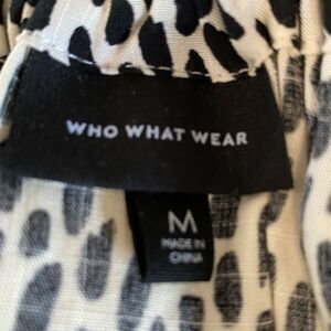 Who What Wear casual top - size M. Mod Black & Creamy White abstract design on 100% rayon - looks like a dripping polka dots or animal print. Short raglan sleeves - elastic cuffs that creates a little ruffle at the hem. Scoop neck with drawstring tie detail ruffles to wear tied or to loosen for a more relaxed look. In excellent pre-owned condition - no damage or flaws.