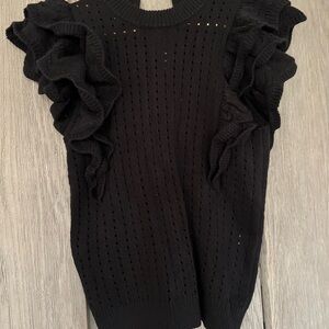 Stylish black button down shirt. Features ruffled sleeves. Perfect for any occasion.
