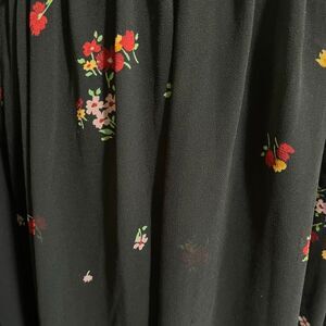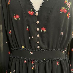 Excellent condition.. Black chiffon overlay with lining. Small floral with high lo hem. Long sleeve. Buttons on front are sparkly.