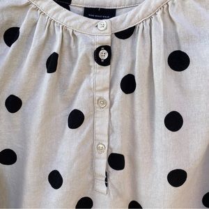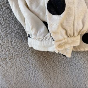 Chic blouse with black polka dots. Long sleeves. Button-up front. Perfect for casual or office wear.