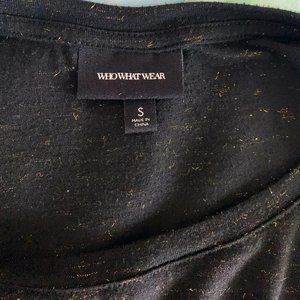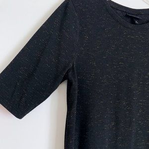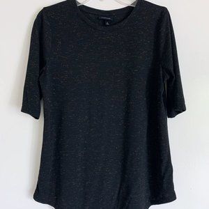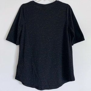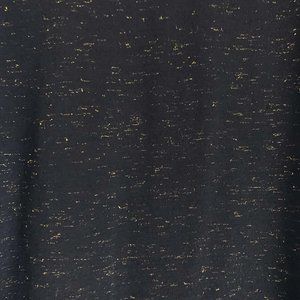 You really can’t go wrong with a basic T-shirt in an ultra-soft fabric. This black top has gold flecks that will give you an extra little shine! Boat neckline, loose fit, and elbow sleeve length. Hit a little bit below the hips. In like-new condition