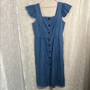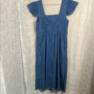 This casual blue sundress features a charming square neckline and flutter cap sleeves, perfect for a relaxed day out. The medium wash blue color adds a classic touch to its lightweight fabric, making it a versatile addition to your wardrobe. Enjoy the effortless style and comfort of this midi-length dress, ideal for any casual occasion. Missing matching belt