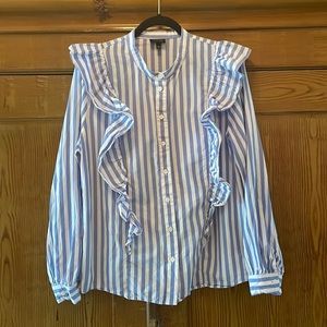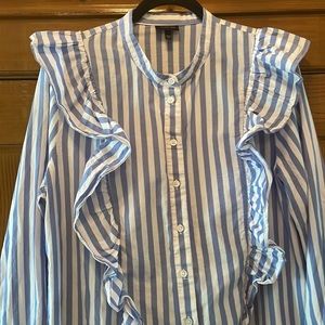 Stylish button down with blue and white stripes. Features ruffled detailing. Perfect for casual or office wear.
