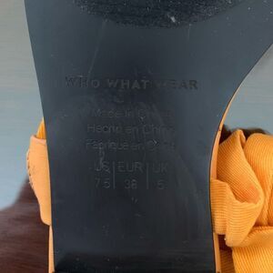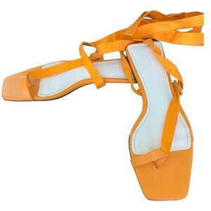Who What Wear Brooke Strappy Sandals in size 7.5. These orange, square-toe sandals are in good pre-owned condition with plenty of life left. They feature grossgrain ribbon ties that wrap around the ankle and a padded heel.