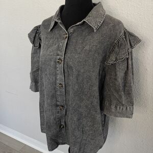 Chic charcoal denim jacket. Features a classic design with a modern twist.