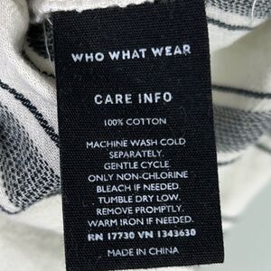 Who what wear 100% cotton button down top in cream with blue stripes. This coastal nautical breathable beachy shirt features a flattering wrap around tie belt waist to allow a perfect fit for any summer occasion. Excellent condition. Women's size M medium, measurements pictured.