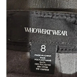 Who What Wear Faux Leather Split Front Pencil Skirt in Black. Size 8. Features banded waist, high rise, front slant pockets, back zipper closure, and hem hits below the knee. Face: Polyurethane Back: 100% Polyester. Excellent pre-owned condition, no flaws.