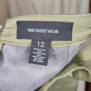 Who What Wear olive green faux leather skirt with slit at front. Midi length, hip pockets, and invisible back zipper. Excellent condition!