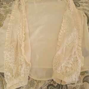 Elegant ivory blouse featuring delicate lace sleeves. Ideal for any occasion. Pre-owned in good condition. Size S