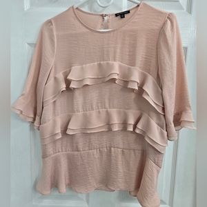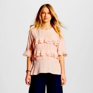 Beautiful layers of ruffles on this blush colored top. Pullover style with one button closure at back neck showing keyhole opening. Sleeves are elbow length with ruffle. 100% polyester. Tuck the bottom ruffle in or leave untucked to show the bottom ruffle.