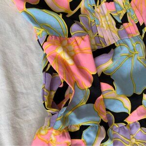 supercute flowy dress withLong sleeves or 3/4 sleeves &Pockets, has button up top & tiered babydoll style skirt,black with bright multicoloured floralPrint