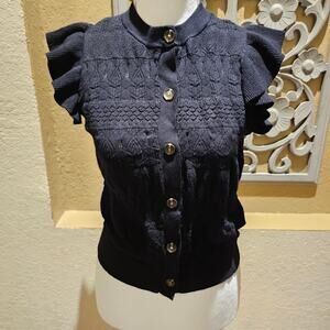 Made from a soft, breathable rayon-blend knit, it has gentle stretch and beautiful texture throughout. The design flatters the silhouette without clinging, and the short sleeves with ruffle detail bring a touch of romantic charm. In excellent condition, showing little to no signs of wear.