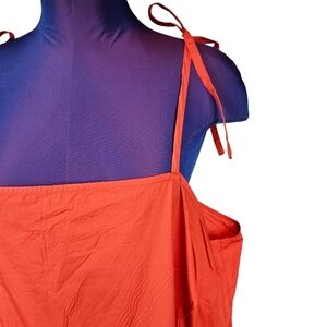 Features crisp woven cotton fabric in bright orange, square neckline with spaghetti straps and faux tie closure, smocked back, sleeveless maxi dress, side pockets, tiered skirt, boho chic, cottage style.
