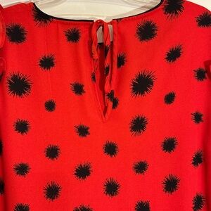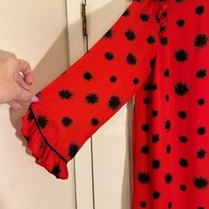 Chic red dress with black floral pattern. Features ruffled sleeves. Perfect for any occasion.