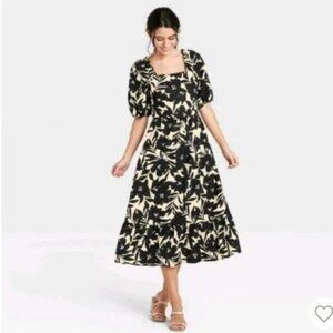 Who What Wear Women's Size Small (US 4 / 6) Linen Blend Black & Cream Floral Midi Dress with Puff Sleeves and Open Back