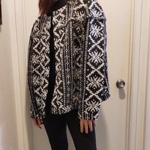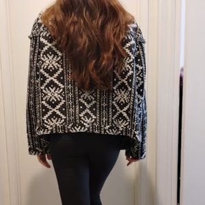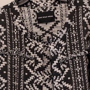 Who What Wear Black and White Southwest Coat with Fringe along the chest, size unmarked, but I think it is a large. Model is size medium, 5'6". Excellent Condition. 55% Cotton, 41% Polyester, 4% other.