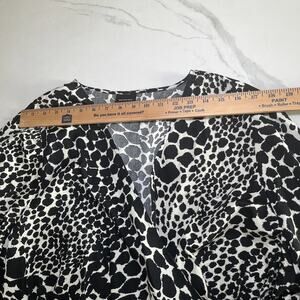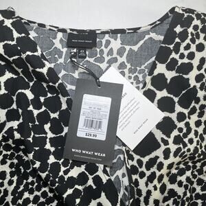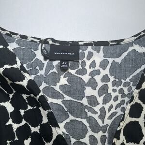 The Who What Wear Top in Women's Plus Size 4X is a stylish and versatile piece with a swirly leopard print, making it perfect for various occasions like travel, parties, or casual outings. This peplum wrap tie blouse features a V-neckline and long sleeves for a flattering fit. Made from 100% cotton, this lightweight and breathable blouse is machine washable for easy care. The black and white color scheme combined with a regular fit and collarless design make it a statement piece that can be worn throughout all seasons, adding a touch of neutral and city-inspired style to any wardrobe.