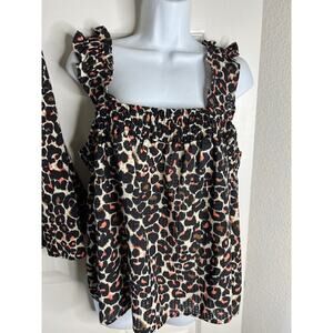 Black with beige, brown and peach animal print tank with smocked top hemline and straps with ruffle.