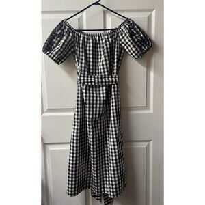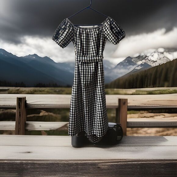 Elevate your wardrobe with this chic off-the-shoulder dress from Who What Wear. Featuring a black and white gingham pattern, this knee-length dress is perfect for any occasion, whether it be a party, cocktail, or casual outing. The dress is made from a high-quality cotton blend fabric and features a pullover closure with puff sleeves and an elastic waist for a comfortable fit. Boasting stylish accents such as an embroidered belt and bohemian theme, this dress is perfect for the fashion-forward woman. The dress is machine washable and is available in size S. Add this fit and flare dress to your collection and make a statement wherever you go.