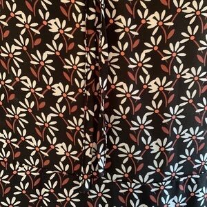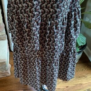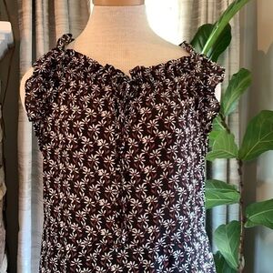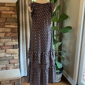 EUC Who What Wear large floral maxi sleeveless maxi dress. Black with white daisy print. Has a peachy pink accent color. Side zip. Ruffle around neck, sleeves, and bottom. Lightweight but is lined.