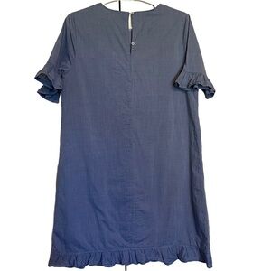 This is a blue, short-sleeved, knee-length shift dress. It has a round neck, a ruffle detail at the hem and sleeves, and a zipper at the back. The dress is made of a lightweight, textured fabric and is fully lined