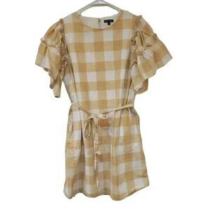 Who What Wear Women's Tan & White Cotton Large Gingham Checked Lined Dress w Ruffle Sleeves, Sash & Pockets EUC sz S