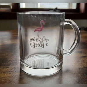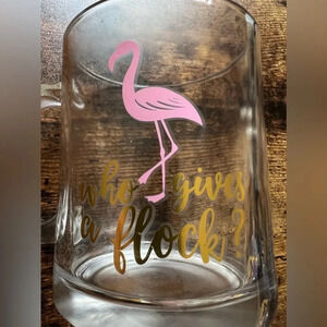 Adorable clear glass mug with a pink flamingo on it with the saying “Who gives a flock” on of. Brand new. NWOT. Perfect for the flamingo lover in your life!