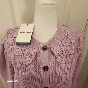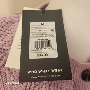 Who what wear purple/pink cardigan button down sweater. NWT. Size Medium. No rips/stains or tears. Material: Cotton/Acrylic, not a think sweater. Measurements: Pit to Pit: 19 inches. Top to Bottom: 22 inches. Has some stretch, I love the crochet look details. Smoke free home. No odors. All offers are welcome. Thank you!