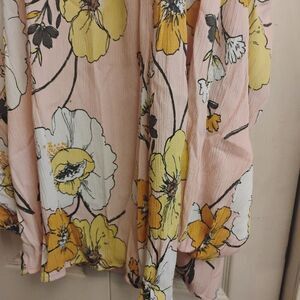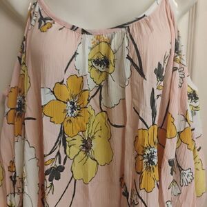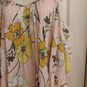 This relaxed camisole features an asymmetrical design with a vibrant pink and yellow floral print. The flowing, airy fabric and slight ruffle hemline add a feminine touch, making it perfect for a cheerful, summery look.