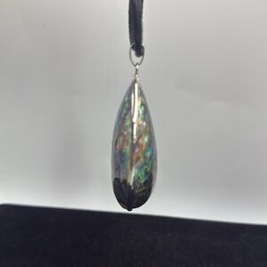 This stunning necklace features a mesmerizing iridescent pendant set in a sleek silver frame. The vibrant colors of the stone are beautifully highlighted by the contrasting black cord, making it a standout piece. Perfect for adding a touch of elegance to any outfit.