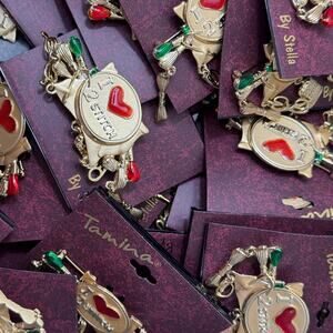 These gold-tone brooches are made by Stella, a leading Fashion Jewelry Supplier for Tamina. Each one comes on it's own card.