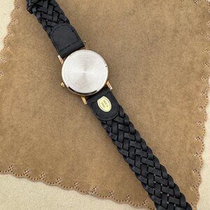 its 1.25 inch in diameter and the braided black leather strap is 9 inches in length. the calf in the center is a second hand that rotates as time goes bye New battery