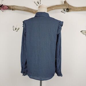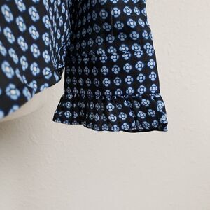 Black with blue flowers button with horizontal ruffle across front. Ruffle cuff