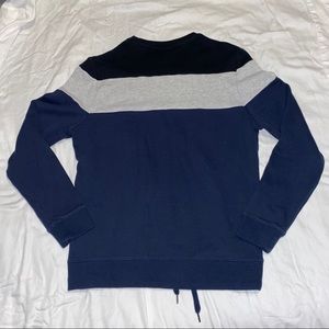 Black gray and navy blue pullover with cinching strings at the bottom. Women’s small. Like new no tears or stains.