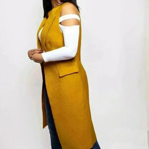 Stay cozy and cool with the Why So Serious midi sleeveless blazer. Lightweight and plush, this rich mustard tone layer is a must-have. Wear it over our Love Over Everything tee or the Sneak Peak off shoulder top.