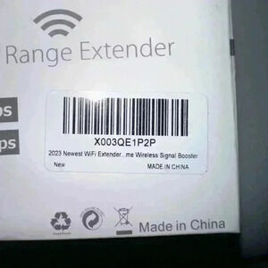 The item is a new Wi-Fi range extender in its original box. The box has some damage, but the extender itself appears to be in good condition. The extender is a 300Mbps model with a US plug. It has a MAC address of 1CBFCE8EA3B8 and a default IP address of 192.168.188.1. The extender is made in China.