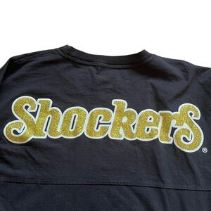 Adorable Women's Small Wichita State University WSU Shockers Long Sleeve Shirt. Crew neck. Black with large sparkly yellow/gold and white logo on bottom front. Sparkly yellow/gold Shockers text with white outline on the back. Two black lines on both sleeves. Perfect for class, game days, or casual wear. Great condition.
